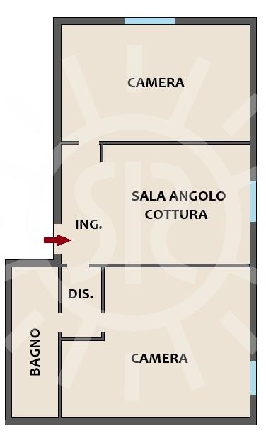 L’appartamento è composto da ingresso su soggiorno con angolo cottura, 2 camere da letto matrimoniali, bagno con doccia e cantina ciclabile.